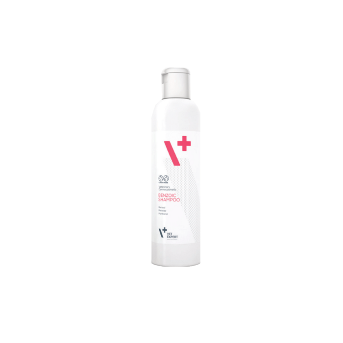 Žiūrėti Kaina 7,99 € VETEXPERT Benzoic šampūnas riebią odą turintiems gyvūnams Sudėtyje esantis benzilo peroksidas mažina odos riebalinimąsi ir veikia antibakteriškai.
