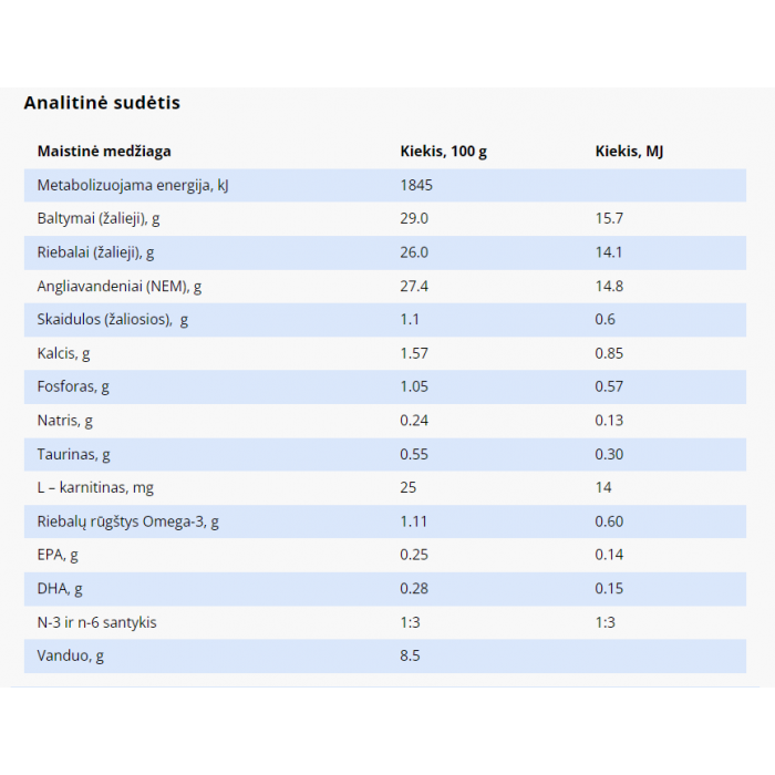 - Priedai/1kg: maistiniai priedai: vitaminas D3 1420 TV, varis 7,1 mg (glicino hidrato vario chelatas), geležis 78,0 mg (geležies sulfato monohidratas), cinkas 150 mg (glicino hidrato cinko chelatas), manganas 5,8 mg (glicino hidrato mangano chelatas), selenas 0,2 mg (seleno metioninas), jodas 3,0 mg (bevandenis kalcio jodatas), taurinas 1 g, L-karnitinas 250 mg; natūralūs antioksidantai .