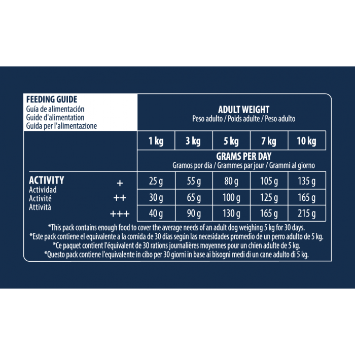 Sudėtis: Vištiena (20%), dehidratuoti naminių paukščių baltymai, kviečiai, ryžiai (10%), gyvūniniai riebalai (stabilizuoti natūralios kilmės tokoferoliais), kukurūzai, kukurūzų baltymai, kukurūzų miltai, sojos pupelių baltymai, hidrolizuoti gyvūniniai baltymai, burokėlių minkštimas, žuvų taukai, plasmos baltymai (natūralus imunoglobulinų šaltinis) (0.4%), kalio chloridas, druska, tetranatrio difosfatas (0,24%), kalcio karbonatas, natūralūs polifenoliai (0.01%).