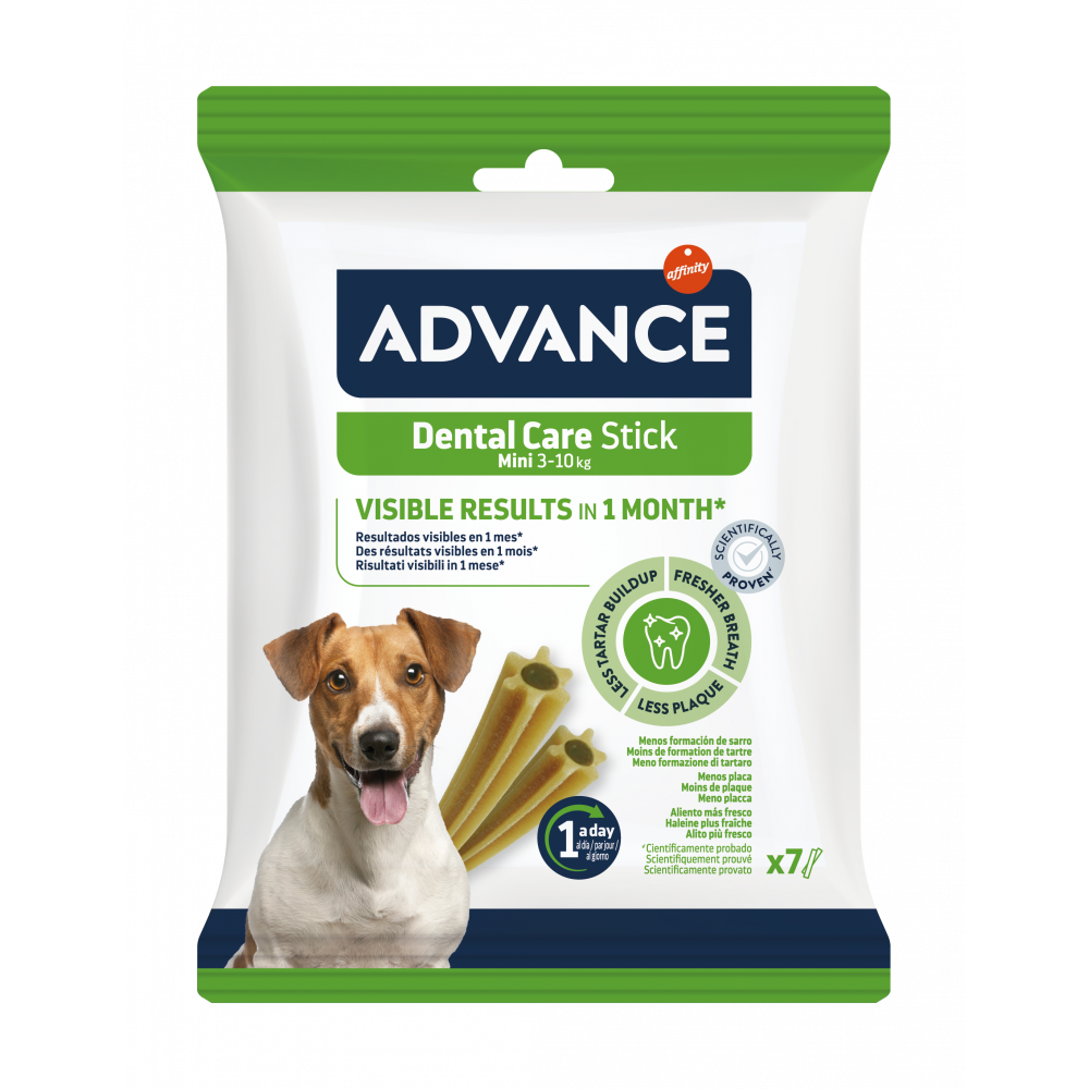 Advance dental care stick mini yra išskirtinis, trigubo poveikio pašaro papildas dantų apsaugai. Šis skanėstas yra skirtas apsaugoti mažų veislių šunų dantis. Kliniškai įrodyti rezultatai yra matomi jau per 1 mėnesį. Skanėstas turi ypatingą formą, kuri padeda pašalinti maisto likučius iš tarpdančių ir riboja apnašų susidarymą. Pirofosfatai padeda išvengti akmenų susidarymo.