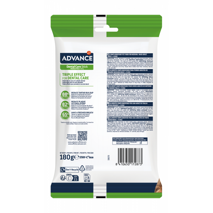 Advance dental care stick yra išskirtinis, trigubo poveikio pašaro papildas dantų apsaugai. Pašaro papildas yra skirtas apsaugoti vidutinių/didelių veislių šunų dantis. Kliniškai įrodyti rezultatai yra matomi jau per 1 mėnesį. Skanėstas turi ypatingą formą, kuri padeda pašalinti maisto likučius iš tarpdančių ir riboja apnašų susidarymą. Pirofosfatai padeda išvengti akmenų susidarymo.