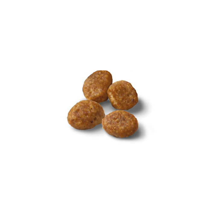 Sudėtis: Lašiša 18%, visos kukurūzų dalys, ryžiai 14%, kukurūzų baltymai, dehidratuoti lašišos baltymai, kiaulių taukai, hidrolizuotos mielės, bulvių baltymai, runkelių minkštimas, mineralai, lignoceliuliozė, cikorijų inulinas0,4% žuvų taukai, bulvių baltymai.