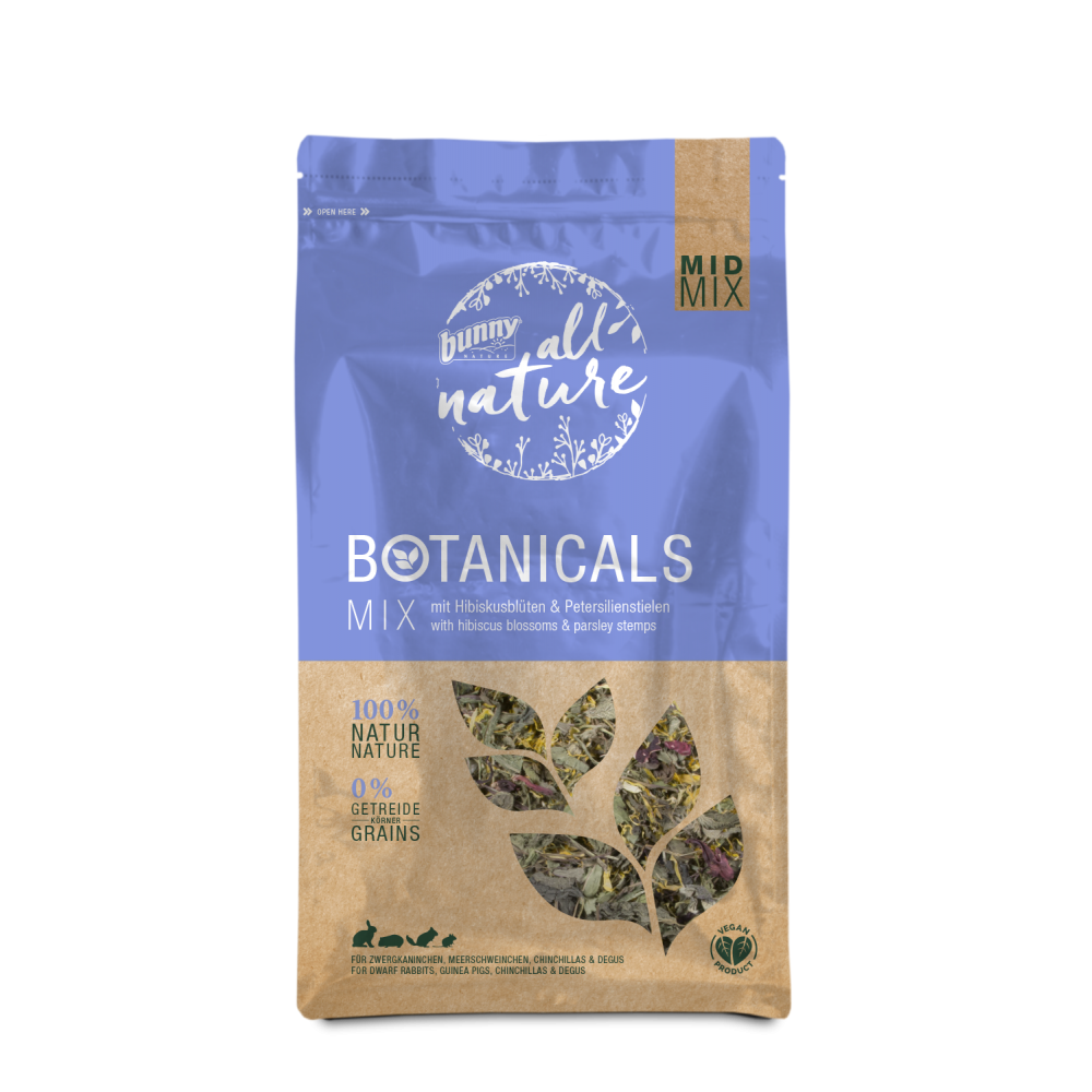 Net kelių rūšių Bunny Botanicals Mid Mix žolelių mišiniai – antrasis subalansuotos ir taisyklingos graužikų mitybos komponentas, jei nusprendėte augintinio mitybą sudaryti patys. Taip pat tai gali būti puikus įprasto graužikų maisto papildas – tiesiog duokite augintiniui tai kaip užkandį.