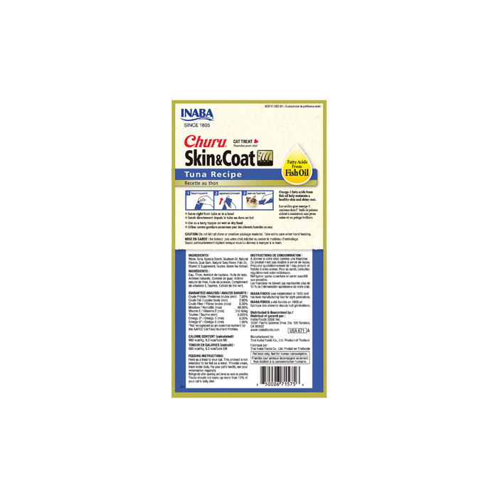 Churu Cat Tuna Salmon kreminiai skanėstai katėms su tunu ir lašiša. Begrūdis skanėstas katėms – tyrelė su tunu ir lašiša. Šie gardūs skanėstai katėms pagaminti iš 100% gryno laukinio tuno! Churu tyrelėse yra daug drėgmės, kuri yra būtina gerai kačių sveikatai. Taip pat šių tyrelių sudėtyje nėra grudų, konservantų ir dirbtinių dažiklių. Juos galite naudoti keliais būdais: duoti laižyti išspaudus iš tūbelės arba naudoti kaip sauso maisto papildą.