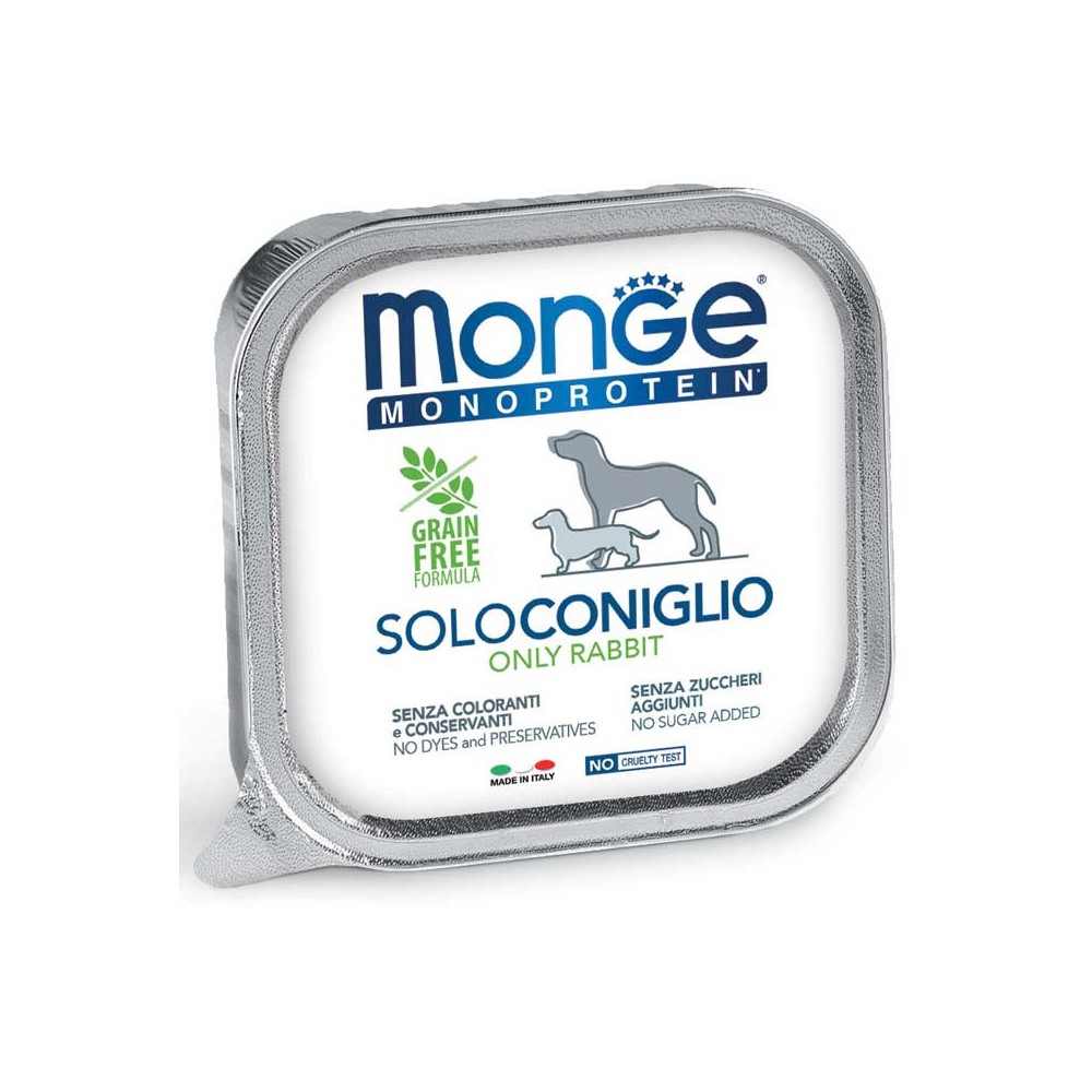 Monge vieno baltymo konservai visų veislių suaugusiems šunims. Sudėtyje yra tik vienos rūšies aukščiausios kokybės mėsa - triušiena. Pašteto tekstūros konservuose nėra grūdų.