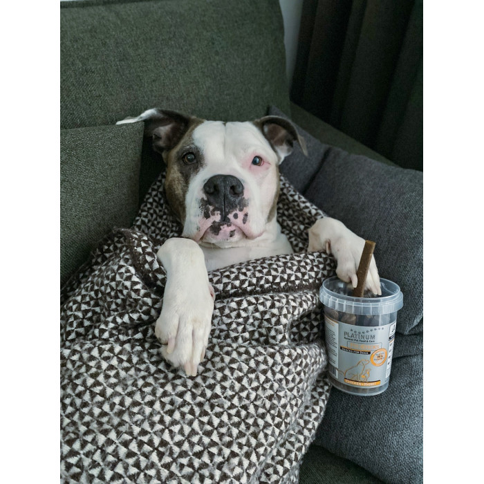 Rekomenduojame: 20–30 g skanėstų 10 kg šuns kūno svorio per dieną. Tai atitinka maždaug 2–3 PLATINUM Fit-Sticks.