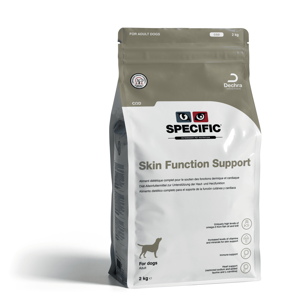 SPECIFIC™ COD Skin Function Support – rekomenduojamas šunims su odos ir kailio problemomis, kurias paveiktų padidintas odai reikalingų maistinių medžiagų, tokių kaip polinesočiosios riebalų rūgštys, vitaminai ir mineralai, suvartojimas bei imuniniais sutrikimais ir uždegiminiais procesais, pavyzdžiui, astma, kolitu sergantiems šunims.