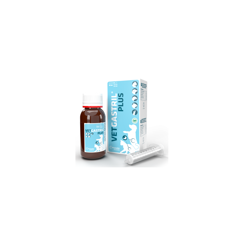 Vet Gastril Plus pašaro papildas šunų, kačių, šeškų, graužikų ir paukščių virškinamojo trakto gleivinei apsaugoti.
